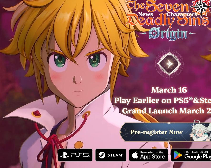 The game includes gacha systems for hero collection tied to the Seven Deadly Sins character roster and new original characters introduced in Origin. Pre-registration opened across platforms including the official website, Google Play, and the App Store, with milestone rewards unlocked based on registration counts.